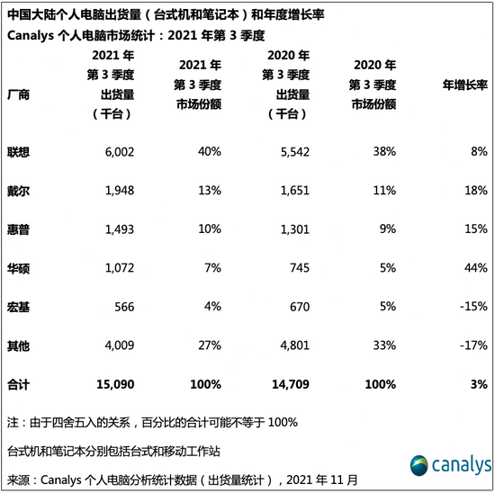 2021年第3季度,中國大陸個人電腦總出貨量(臺式機和筆記本)同比增長3%,環比增長10%,總出貨量達到1500萬臺。與去年相比,臺式機(包括臺式工作站)的出貨量增長3.8%,達到530萬臺。筆記本(包括移動工作站)的出貨量小幅增長1.9%,達到970萬臺。總出貨量超過了2020年第3季度的1470萬臺紀錄,創下第3季度歷史新高。
