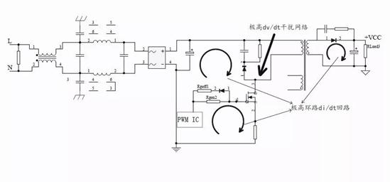 我們可以采取措施減小高頻電位跳變點的PCB環路面積。增加高頻高壓直流電容C_IP是減少PCB環路面積和分離高頻和低頻兩個部分回路有效措施。