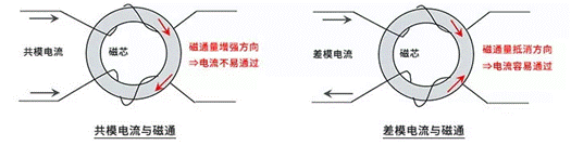 如圖所示,差模電流是在2根導線上往復流動,因此磁芯產生的磁通方向相反,磁通抵消,因此不能起到扼流作用,而是直接通過。