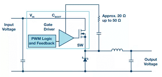 圖2:使用自舉電阻減慢異步降壓轉換器中的開關轉換