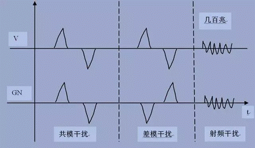 經常在實際操作中,對系統損傷很大的都是低頻的共模干擾,譬如大功率電機、斷路器或開關,短路,雷擊感應等。這些類型大都是外來的共模信號,其脈寬在數百us到s之間,周期很長也是數秒,這樣的脈沖持續引起對地的高電壓波動,從而損傷系統。但是對于高頻共模干擾,從干擾源開始,大部分能量是以輻射的方式作為能量傳輸途徑的,而且這樣的共模干擾多產生于系統本身。