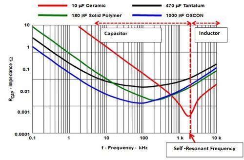 我們可以使用電容組合使阻抗曲線“變平”,以在推高降壓轉換器的開關頻率的同時,使其仍處于電容區域內。電容阻抗因技術和開關頻率而異。