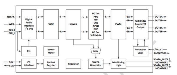 工作電源電壓范圍:5V -28V;32個可編程雙四分量濾波器,I2S輸出,2通道立體聲(20W x 2 BTL)3波段動態范圍控制,DRC控制,音量控制。