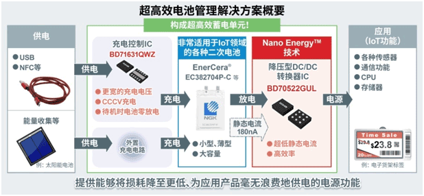 在本解決方案中,搭載超低靜態(tài)電流技術(shù)“Nano Energy™”的電源IC可以更大程度地降低應(yīng)用產(chǎn)品電源部分的功耗,同時(shí),支持各種二次電池的充電控制IC可為各種二次電池提供相匹配的充電。