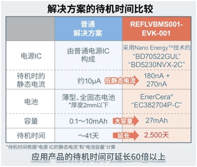 本評(píng)估板“REFLVBMS001-EVK-001”使用了厚度為0.45mm、電池容量為27mAh的二次電池“EnerCera® EC382704P-C”,由搭載了“Nano Energy™”技術(shù)的待機(jī)靜態(tài)電流180nA的超低功耗IC“BD70522GUL”作為高效電源,由支持2.0V~4.7V充電電壓的充電控制IC“BD71631QWZ”負(fù)責(zé)適合電池的充電、監(jiān)控和放電控制,這些器件共同構(gòu)成蓄電單元。包括用來檢測(cè)異常電壓的復(fù)位IC“BD5230NVX-2C”在內(nèi),待機(jī)時(shí)的靜態(tài)電流非常低,不僅可以為應(yīng)用產(chǎn)品提供毫無浪費(fèi)的電源功能,與普通的解決方案相比,還能將應(yīng)用產(chǎn)品的待機(jī)時(shí)間延長(zhǎng)60倍以上。本評(píng)估板可以輕松評(píng)估這種解決方案。此外,所有安裝元器件的厚度都在0.60mm以下,加上PCB板的厚度也僅有1.60mm的超薄厚度,因此還可以作為參考設(shè)計(jì)直接裝入卡片型物聯(lián)網(wǎng)設(shè)備(智能卡)中。