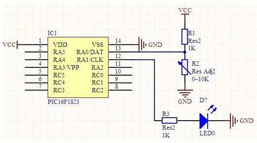 我們先看看R1和R2,R2是個可調電阻如果我們將R2變大RA1這個管腳上的電壓就越大。R2變小RA1這個管腳上的電壓就越小。那單片機是怎么知道電壓變化的。這就需要AD轉換。就是將模擬量轉換成數字量。