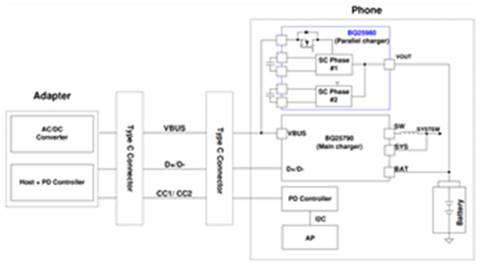 在BQ25980的實際應用中,如圖一所示,通常需要搭配使用傳統(tǒng)的電感型充電芯片(如BQ2579x系列),組成主、副配合的快速充電系統(tǒng)。其中,作為主充電芯片的BQ2579x負責完成充電協(xié)議的基本檢測、電池的預充電、涓流充電與截止充電等階段,并結(jié)合電源路徑管理功能為系統(tǒng)負載提供穩(wěn)定的供電;而作為副充芯片的BQ25980負責在電池的恒流充電、恒壓充電等階段實現(xiàn)高效率、大功率的快速充電。