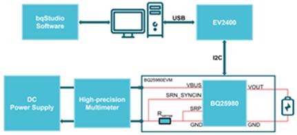 進一步地,可以基于BQ25980的EVM板對該電流檢測方法進行驗證實驗。具體的測試方案如圖3所示。