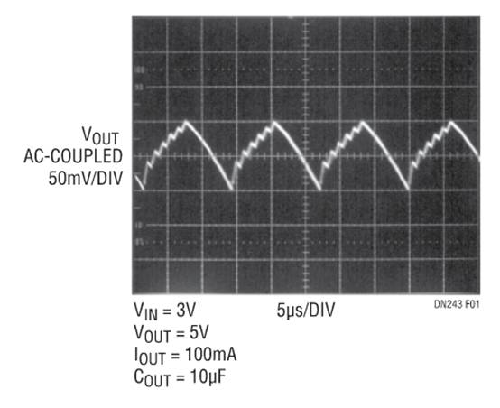 即使采用小型輸出電容器,器件的2MHz振蕩頻率也可允許低輸出紋波,圖2給出了LTC3200-5采用不同值的輸出電容器支持100mA負載電流時的輸出紋波情況。