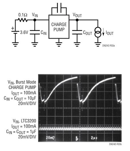 雖然單獨恒定頻率可改善輸入噪聲,但LTC3200系列還前進了一步,它采用獨特的內置控制電路來調節充電泵在兩個時鐘相下的輸入電流,這種技術可以防止RC電流在充電泵振蕩器的一個或兩個半時鐘周期內的衰減,這因為改變輸入電流而將參照輸入紋波降至最小。圖3給出了LTC3200與典型突發方式充電泵之間的輸入噪聲差異。如圖所示,兩個器件都可從3.6V的輸入電壓中獲得100mA的輸出電流和5V的穩定輸出電壓。0.1Ω的輸入阻抗是用來做測試用的。典型突發方式充電泵器件在輸入和輸出均采用10μF陶瓷電容器,LTC3200采用具有相同介電質的1μF陶瓷電容器。如圖3所示,即使旁路電容減小到1/10,采用LTC3200也可顯著降低輸入噪聲。