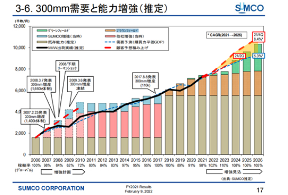 Sumco 預(yù)計,2021~2025 年期間硅晶圓市場復(fù)合年增長率預(yù)計將達 10.2%。2026 年全球 12 英寸有望達到 1100 萬片 / 月,2022 年-2026 年硅片將維持供不應(yīng)求態(tài)勢。這意味著,2022 年-2026 年,半導(dǎo)體硅片行業(yè)需要大量新建投資。