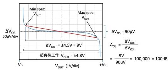 如下圖,橫坐標輸出電壓Vout從負電源軌-Vs到正電源軌+Vs變化。藍線代表開環增益,開環增益會在接近電源正負軌時,我們可以看到急劇惡化。