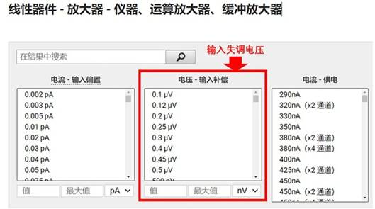 在Digi-Key網站,我們可以在【Digi-Key放大器】產品頁面,通過參數篩選放大器,輸入失調電壓對應的是“電壓-輸入補償”選項。