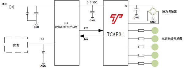 TCAE31-QDA2包含TACE11-QDA2的所有電容觸控功能,另外還集成了惠斯通電橋模擬前端電路,包括低噪聲電壓源,2級最高1024倍增益放大PGA, 高精度ADC,失調電壓動態補償等電路單元,可實現22 bits寬動態和最小3.6uV信號測量,適合于外接多種形式的電橋類傳感器用于壓力檢測和測量功能,適用于MEMS壓感,應變片壓感,及電阻壓感等多種壓力傳感器的信號調理和采集及算法處理。是全球首款同時集成電容觸控和壓力觸控的車規級SoC芯片。TCAE31-QDA2充分考慮了實際應用中可能面臨的復雜變化要素,如由于裝配,溫度,濕度,老化,干擾等引起的參數變化,通過寬范圍實時動態補償結合智能演算法實現壓力檢測的持續可靠性。再結合電容觸摸通道,實現電容+壓感復合智能按鍵,可真正實現汽車應用所須的高抗干擾,防誤觸,防水等高可靠性要求,適用于如智能表面,智能B柱,智能中控,智能Logo,智能門把手等復雜車內和車外應用環境。