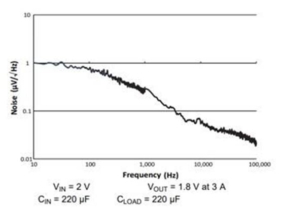 隨著衛星在太空中運行10年或更長時間,使機載集成電路充分發揮性能有助于確保設計壽命。為了向高性能時鐘、數據轉換器、數字信號處理器或模擬元件提供干凈、低噪聲的電源軌,LDO 電路需產生超小的內部噪聲。由于不容易濾除內部產生的 1/f 噪聲,因此應采用具有固有低噪聲特性的 LDO。低頻噪聲通常是最大的,也是最難濾除的。TPS7H1101A-SP 提供超低的 1/f 噪聲水平,在 10Hz 頻率下的峰值約為 1µV/√Hz。有關 RMS 噪聲隨頻率變化的情況,請參閱下面的圖 1。
