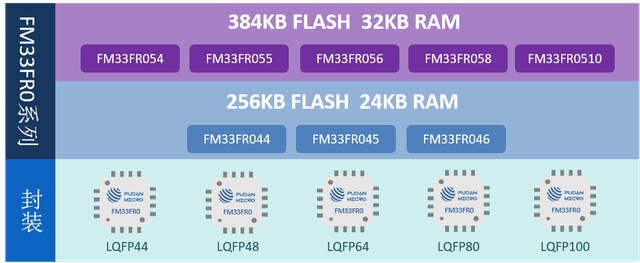 FM33FR0系列基于32 ARM Cortex-M0內(nèi)核,最高主頻為48MHz,提供最大384KB Program FLASH8KB Data FLASH50萬次擦寫),flash支持ECC;最大32KB RAM,帶有奇偶校驗;支持LQFP44 / LQFP48 / LQFP64 / LQFP80 / LQFP100多種封裝形式。
