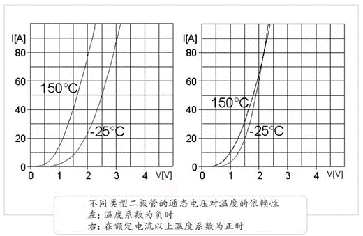 判斷一個二極管是否適合并聯的重要參數是其通態電壓對溫度的依賴性。如果通態電壓隨溫度的增加而下降,則它具有負的溫度系數。對于損耗來說,這是一個優點。