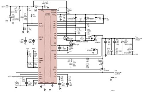 圖 1 示出了一個(gè) 15V 至 55V 輸入、25.2V/6.3A 降壓-升壓電池充電器,其具有一個(gè)高效率四開關(guān) (M2~M5) 同步降壓-升壓型 DC/DC 轉(zhuǎn)換器,僅需一個(gè)電感器(L1)。專有的平均電流模式架構(gòu)采用兩個(gè)檢測(cè)電阻器(RCBRT1和 RCBRB1) 來監(jiān)視電感器電流。在該降壓-升壓型解決方案中,當(dāng) VIN高于 VOUT 時(shí),轉(zhuǎn)換器在降壓模式工作;當(dāng) VIN 低于 VOUT 時(shí),轉(zhuǎn)換器則工作在升壓模式。當(dāng) VIN接近 VOUT時(shí),轉(zhuǎn)換器工作于四開關(guān)降壓-升壓模式。