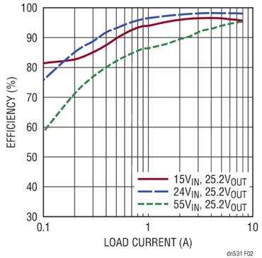 轉(zhuǎn)換器以一個(gè)可編程的恒定開關(guān)頻率運(yùn)作,該頻率處于 50kHz 至 500kHz 的范圍內(nèi),采用一個(gè)電阻來設(shè)定 (R13 = 100k,250kHz)。圖 1 示出的這款解決方案能夠?yàn)橄到y(tǒng)負(fù)載提供高達(dá) 8A (VOUT= 25.2V)。如圖 2 所示,滿負(fù)載效率 (IOUT= 8A,VIN= 24V) 可達(dá) 98% 以上。