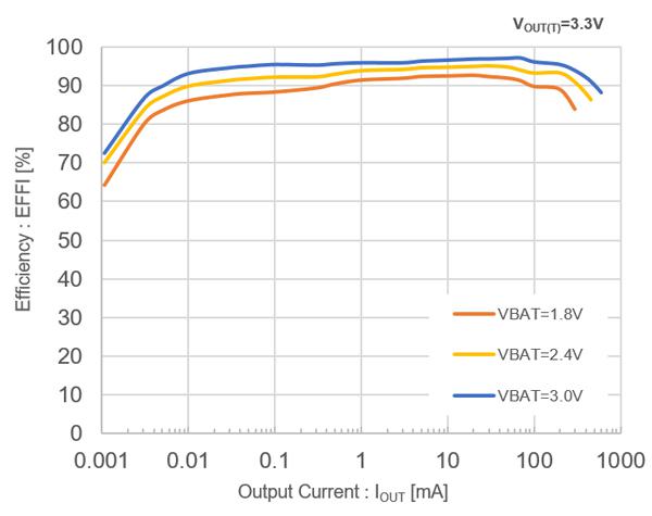 XC9145系列的超低消耗電流電路將電流消耗降低至400nA,同時采用PWM/PFM控制方式使得產品在輕負載下顯著提高效率,特別是輸出電流為數μA時,與傳統DC/DC轉換器相比,效率得到大幅提高(圖1)。VIN=2.4V、VOUT=3.3V、IOUT=10μA時的效率達到 89.9%,兼容低功耗的MCU和SoC。 無需復雜控制,也可以顯著降低恒定升壓工作有較大的系統待機時間的 IoT和便攜式設備的功耗,貢獻于延長電池使用時間