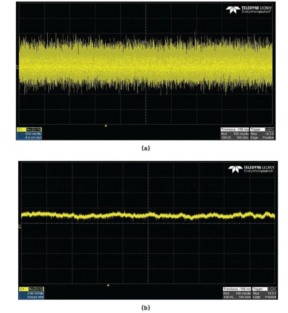 圖3.濾波之前和之后。(a)在C4處(濾波之前)測量時,升壓穩壓器輸出的噪聲含量約為0.2%。