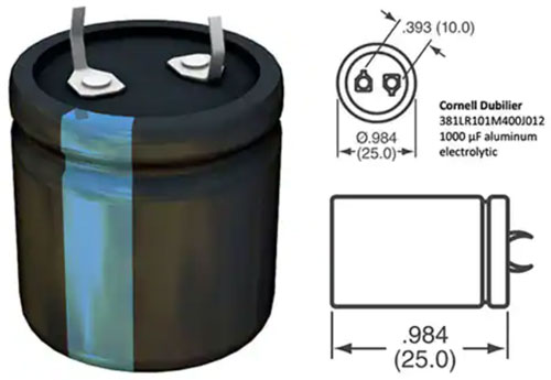 圖 2:381LR 鋁電解電容器的額定電壓為 200 至 450 VDC,額定電容為 56 至 2200 μF。(圖片來源:Jeff Shepard,基于 Cornell Dubilier Electronics 提供的原始材料)