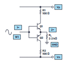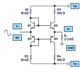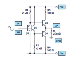 開始之前,請確保關閉ADALM2000上的電源。電路和實驗室硬件的連接如圖1所示。示波器輸入1應連接到Q1和Q2基極的接合處。示波器輸入2應連接到Q1和Q2發射極的接合處。