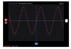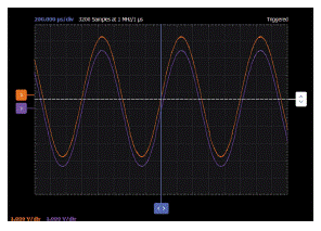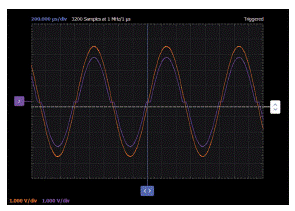 波形發生器W1配置為1 kHz正弦波,峰峰值幅度約為6 V,偏移為0。使用示波器通道1觀察W1的輸入,使用示波器通道2觀察放大器在RL處的輸出。