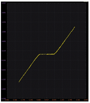 接下來施加電源并調整波形發生器,使W1為100 Hz三角波,其偏移為0 V,峰峰值幅度為3 V。在x-y模式下使用示波器觀察電路的電壓傳輸曲線。圖4為Scopy XY波形圖示例。