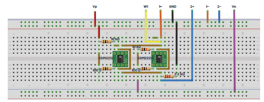 示波器的通道1應連接為顯示第一發生器的輸出,兩個通道(1和2)均應設置為以每格1 V顯示輸出。面包板連接如圖2所示。