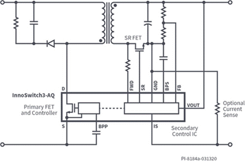 這款簡單的反激式變換器設計集成了碳化硅開關以及初級和次級控制器。InnoSwitch3-AQ