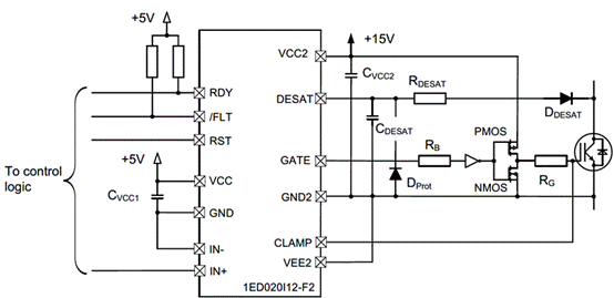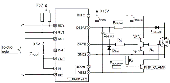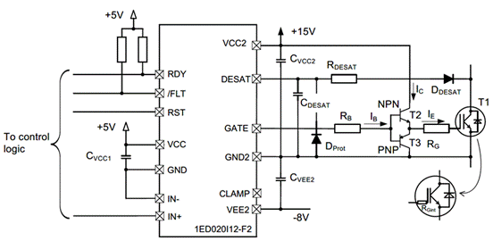 以1ED020I12-F2電流拓展設計為例,例子中帶有源米勒鉗位功能: