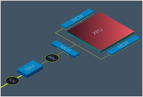 大電流傳輸通過模塊化電流倍增器 (MCM) 模塊實現,這些模塊布置在主板或處理器基板上,與處理器相鄰。將 MCM 布置在基板上,不僅可最大限度降低 PDN 損耗,而且還可減少電源所需的處理器基板 BGA 引腳。LPD 旨在支持 OCP 加速器模塊 (OAM) 卡及定制 AI 加速器卡的供電需求和獨特封裝。