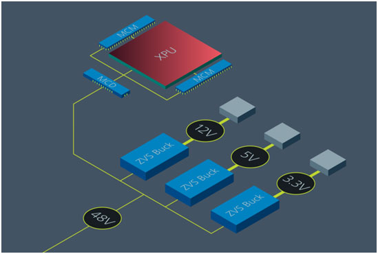分比式電源架構將電源分解為專門的穩壓及變壓功能。這兩個功能可以單獨優化、部署,提供一個高密度、高效率的解決方案。該解決方案不同于傳統 12V 多相位方案,主要依靠開關穩壓器和電感器的并聯陣列。這一傳統方案很難推廣:功率越大,并聯的穩壓器越多,整體尺寸越大,而且處理器大電流傳輸的距離也就越遠。所有這些都會使系統出現更多的損耗。