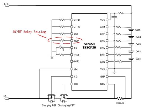 SC5550支持充電過壓保護OVP(保護點從3.0 V 到4.575V可選)、放電欠壓保護UVP(保護點從1.2V到3.0V可選),涵蓋磷酸鐵鋰、鋰離子/鋰聚合物等多種鋰電池。此外,SC5550的OVP和UVP保護檢測延時可以通過專用管腳RDP電阻進行配置,支持用戶靈活配置保護延時參數。