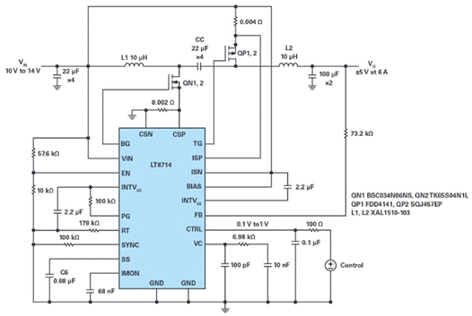 圖1.基于LT8714的雙象限電源的電路圖,6 A時(shí),其VIN 12 V,VO ±5 V。
