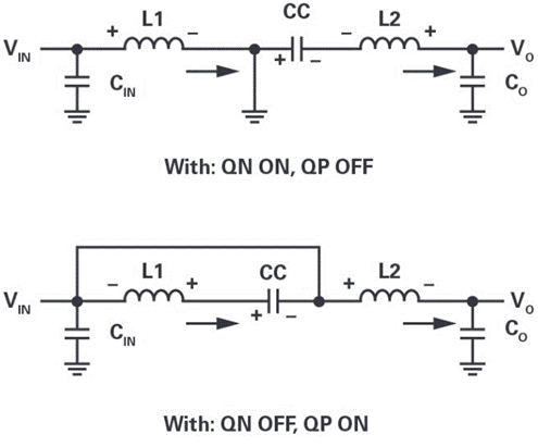 圖1所示為雙象限電源LT8714的電路圖。動(dòng)力系統(tǒng)由NMOS QN1、NMOS QN2、PMOS QP1、PMOS QP2、電感L1、電感L2、耦合電容CC,以及輸入和輸出濾波器組成。電感L1和L2是兩個(gè)分立式非耦合電感,可以降低變換器成本。