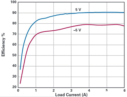 圖3.變換器效率曲線:VIN為12 V,VOUT為+5 V和–5 V,IO為6 A。