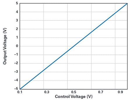 圖4.輸出電壓VOUT與控制電壓VCTRL的關(guān)系圖。當(dāng)VCTRL從0.1 V增加至1 V時(shí),VOUT從–5 V逐漸變化到+5 V。