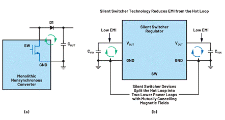 圖1. (A) 異步單芯片升壓轉換器具有單個熱回路,其中包含一個外部續流二極管。(b) Silent