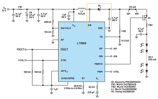 LT3950 LED驅動器是一個異步單芯片1.5 A、60 V升壓轉換器。升壓轉換器熱回路(黃色突出顯示)包含一個分立式續流二極管,不會減弱高頻率輻射。