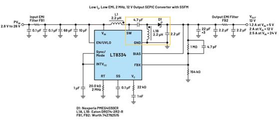 SEPIC還是能保持低輻射。EVAL-LT8334-AZ SEPIC 12 VOUT 評估套件也使用2