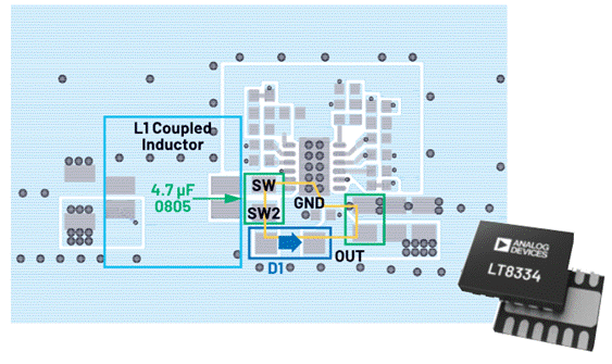 (EVAL-LT8334-AZ)的熱回路布局中包含這個微型DFN、一個陶瓷耦合電容、一個陶瓷輸出電容和一個小型續流二極管。