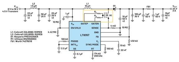 Ω電阻RP(在GATEP上)就足以降低M1功率MOSFET的開啟邊緣速率,并將電磁輻射騷擾保持在盡可能低的水平。當然,一些輻射濾波器和SSFM也有助于減少輻射。EVAL-LT8357-AZ評估板還額外留出了輻射屏蔽位置,但對于大部分應用,可能沒有必要。這個異步升壓控制器與它的單片式版本非常相似,具有高功率、低EMI升壓和SEPIC應用所需的所有功能。