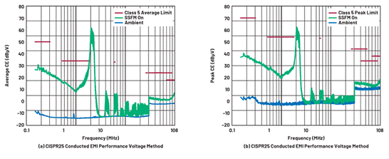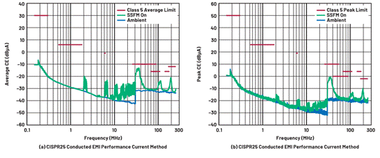 圖10. DC2788A LT3950通過了(a)平均和(b)峰值CISPR 25