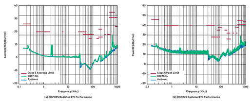 圖11. DC2788A LT3950通過了(a)平均和(b)峰值CISPR 25 5類電磁輻射測試。