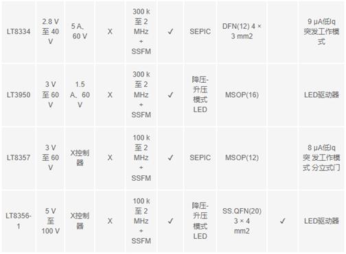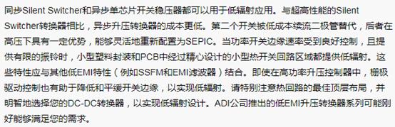 MHz和SSFM,能提供低輻射。EVAL-LT8357-AZ升壓控制器可以實現相似的性能。有關這些器件的完整輻射結果、原理圖和測試選項,可以訪問analog.com,查看對應的產品登錄頁面。表1列出了一個新的低EMI異步升壓和SEPIC轉換器系列。單芯片IC和控制器IC結構簡單、成本低,采用多種拓撲,具有大功率功能和低輻射,因此非常實用。當超低輻射成為首要的要求時,也可以使用高電流Silent