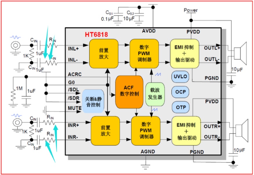 二,骨傳導耳機一般采用6/12dB,用HT6818替換TPA2012需外接輸入電阻降低增益;