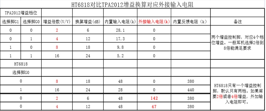 HT6818替換TPA2012時增益換算對應的輸入電阻值