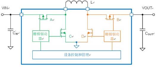 降壓-升壓轉換器將降壓轉換器(圖1中的綠色部分)與升壓轉換器(圖1中的橙色部分)合并在同一結構中,從而可以有效地升高和降低輸出電壓。控制環路可以根據實際的輸入電壓和編程設定的輸出電壓來決定設備是否需要在降壓或升壓模式下運行。